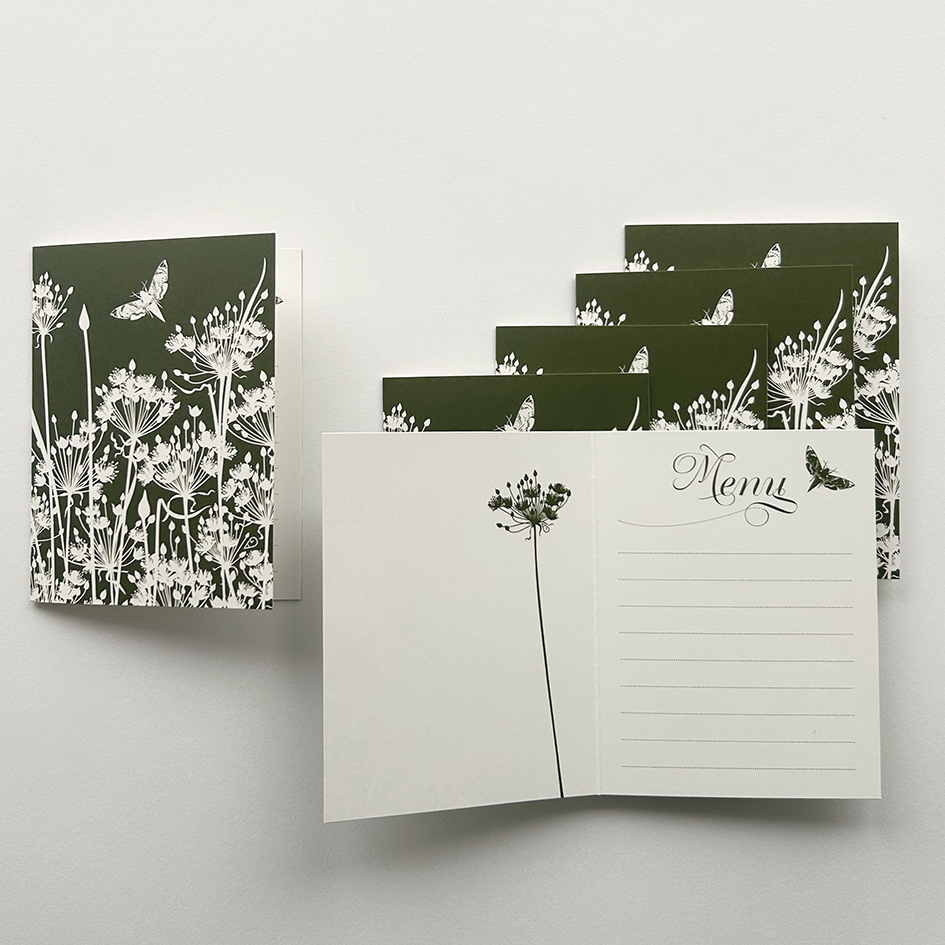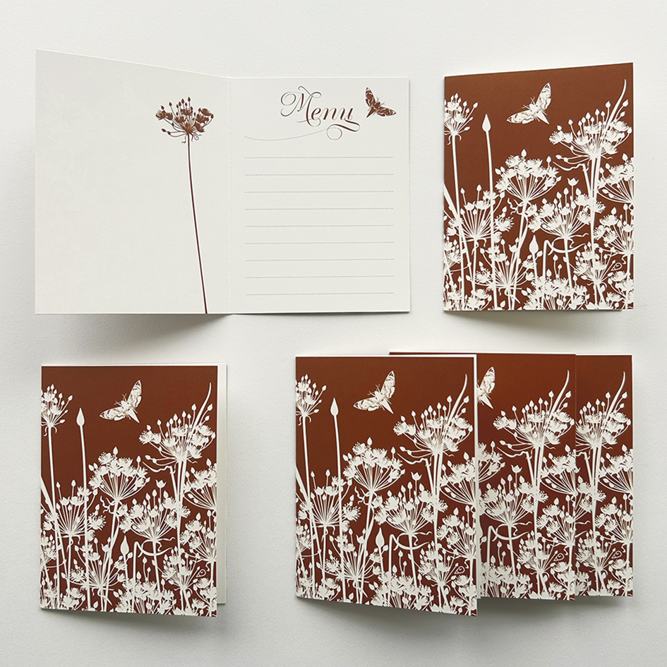 Maak je mooi gedekte tafel en al het verrukkelijks dat erop staat helemaal af met deze feestelijke menukaartjes! Zes stralende kunstwerkjes, uitgesneden door Geertje en afgedrukt op roomwit eco papier. De zwanenbloem symboliseert liefde, trouw en schoonheid. Ga je voor warme, diep steenrood gekleurde kaartjes? Of kies je de sfeervolle Olive Green? Hoe dan ook ga je helemaal de blits maken en het leuke is: ze zijn áltijd bruikbaar: 6-Gangen met Kerst, een uitgebreid verjaardagsdiner voor vrienden. Of gewoon om op maandagavond je avg’tje in het zonnetje te zetten. Smakelijk!
